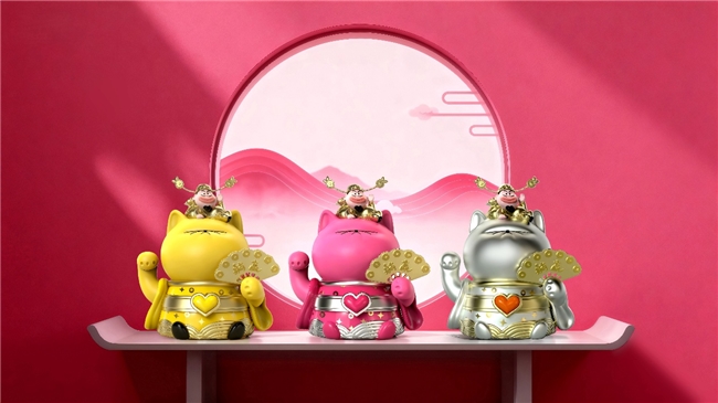 这一跨界新物种,首先区别于传统招财猫的 “老气刻板”。品牌摒弃了传统招财猫的固化造型,采用潮玩行业主流的 Q 版萌系头身比(1:1),以圆润无棱角的线条营造亲和感,同时融入现代设计中的 “潮奢质感”—— 局部亲肤手感漆与光油的碰撞,形成哑光与亮光的质感对比,既保证了触摸时的细腻体验,又提升了视觉上的高级感。这种 “传统符号 + 现代工艺” 的组合,让招财猫摆脱了 “长辈专属” 的标签,成为年轻人愿意主动展示、分享的潮流单品。