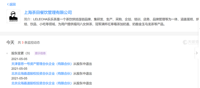 第一、在今年的5月份,乐乐茶关联主体上海茶田餐饮管理有限公司发生股权变动。天津普思一号资产管理合伙企业(有限合伙)、北京众海嘉道股权投资合伙企业(有限合伙)、北京众海嘉速股权投资合伙企业(有限合伙)三家公司退出乐乐茶股东席位。